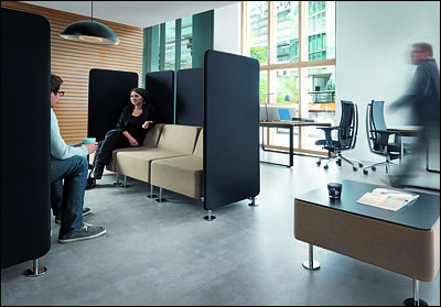 Bardzo ważnym dopełnieniem są ścianki wykończone elastyczną tkaniną, pełniące rolę oddzielającą i wyznaczającą przestrzeń, w której można przeprowadzić kameralną rozmowę.